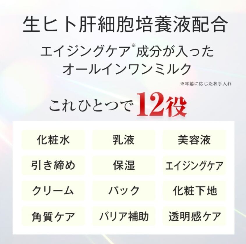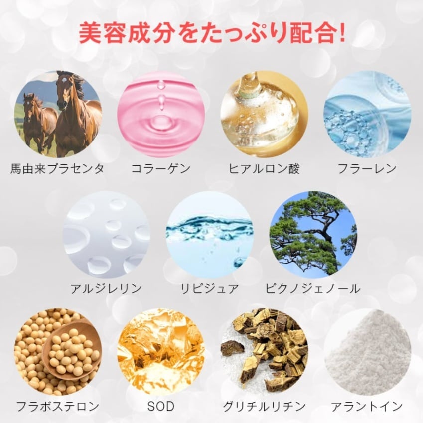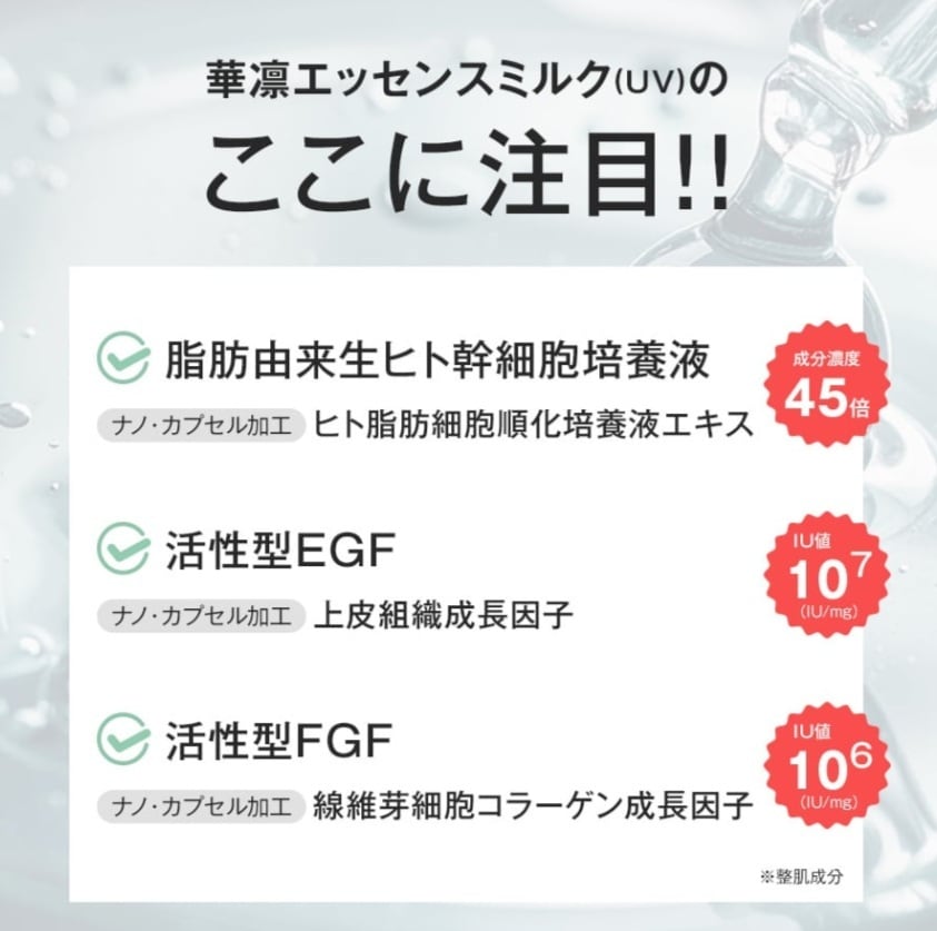 **成分**:脂肪由来ヒト幹細胞培養液、活性型EGF、活性型FGF、コラーゲン、馬プラセンタ、フラーレン、アレジレリン、リピジュア、ピクノジェノール、フラボステロン、ヒアルロン酸、SOD、グリチルリチン、アラントイン